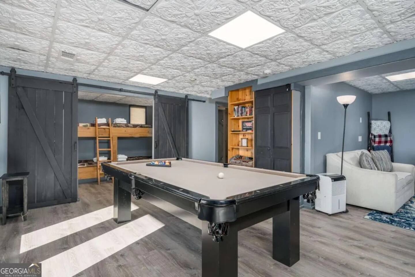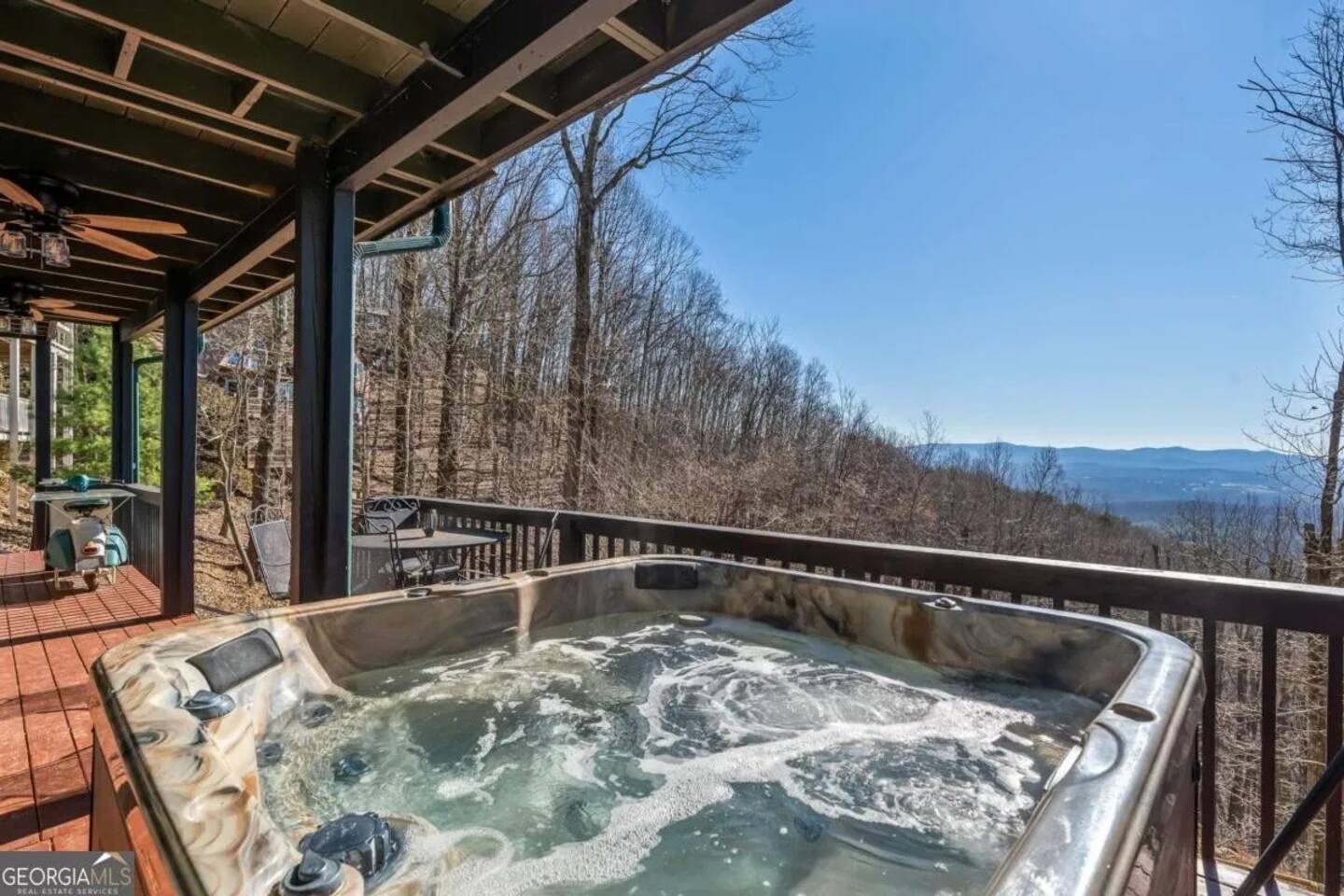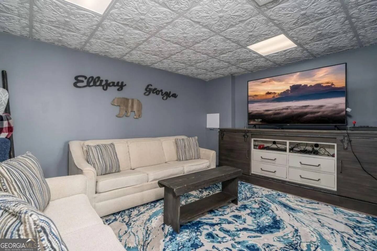 **HIGHLIGHTS** EXPLORE NEARBY - All paved roads to access the cabin, including a paved driveway - Located in a gated community with resort amenities: Olympic sized swimming pool, tennis courts, basketball court, kids playground, waterfall, hiking trails, lakes (fishing-friendly!) and a fully-fenced dog park! - 15 mins → downtown Ellijay - 14 mins → downtown East Ellijay - 26 mins → downtown Blue Ridge WELCOMING ENTRY - Detailed, step by step check-in directions - Parking for 5 cars - Smart lock for convenient & secure access - Covered and well-lit front porch: 3 rocking chairs and ceiling fan - Custom guidebook with local recommendations ENSUITE TOP LEVEL - Primary bedroom suite 1: King sized bed, 45" smart TV, ceiling fan, attached full bathroom, & double patio doors onto a private balcony with seating - Primary bathroom ensuite 1 with walk-in shower with shower wand - Lofted office space with: a computer desk, desktop monitor, keyboard, ergonomic chair, and rocking chair OPEN CONCEPT MAIN LEVEL - Primary bedroom suite 2: King sized bed, 45" smart TV, ceiling fan, attached full bathroom *ideal for those wanting to limit stair usage - Primary bathroom ensuite 2 with tub/shower combo with shower wand - Living room: 55" Smart TV, leather couches, & gas fireplace - Dining room with table for 6 - Eat-in Kitchen with cooking and dining essentials, including a dishwasher, ice-maker, gas stove, & dining peninsula with seating for 4 - Full sized laundry - Main deck and fully-fenced yard access (with outdoor living and dining) ENTERTAINING LOWER LEVEL - Bedroom 3: Double bunk beds with 4 twin beds - Bathroom 3 with walk-in shower and shower wand - Second living room: 65" smart TV and XXXX games - Game room with Foosball and billiards/pool table - Lower deck and fully-fenced yard access (with outdoor living and dining) SOAK IN THE OUTDOORS - Primary Bedroom Ensuite Deck: Private balcony with seating - Main level deck: Gas grill, outdoor sofa, 2 Adirondack chairs, & a dining table with seating for 4 (extra chairs available), with access to fully-fenced backyard - Lower deck: Hot tub, dining table with seating for 4 (extra chairs available), & custom Vespa table, with access to fully-fenced backyard - Shrouded in trees, providing privacy and beautiful surroundings - Neighborhood natural features: 4 lakes, ponds, hiking trails, and waterfall access BRING THE FAMILY - Resort amenities: Olympic sized pool, tennis courts, hiking trails, lakes, fishing, basketball court, playground, and a fully-fenced dog park! - Main floor bedroom & attached bathroom - Waterproof mattress and pillow covers on in all bedrooms - Blackout window treatments - Bathtub - Plastic dinnerware, silverware, & cups - Fully fenced yard - Full sized laundry - Leather sofas - 2 Living rooms - Streaming channels provided: Tubi, Roku Channel, Pluto, PBS - Game room: Foosball & billiards/pool table - Pet-friendly - Fully-fenced decks and yard RESORT NEIGHBORHOOD AMENITIES - Private, gated community - Olympic-sized swimming pool - Tennis courts - Basketball court - 4 Lakes (fishing permitted) and small creeks - Hiking trails, one leads to a waterfall - Kids playground - Fully-fenced dog park ADDED FOR COMFORT - Smart home features: smart locks, electronics, and high-speed WiFi - Extra pillows and linens - A Meta-CapitalLLC listing: Superhosts, so you can be confident in a pleasant experience STR License: 004232
