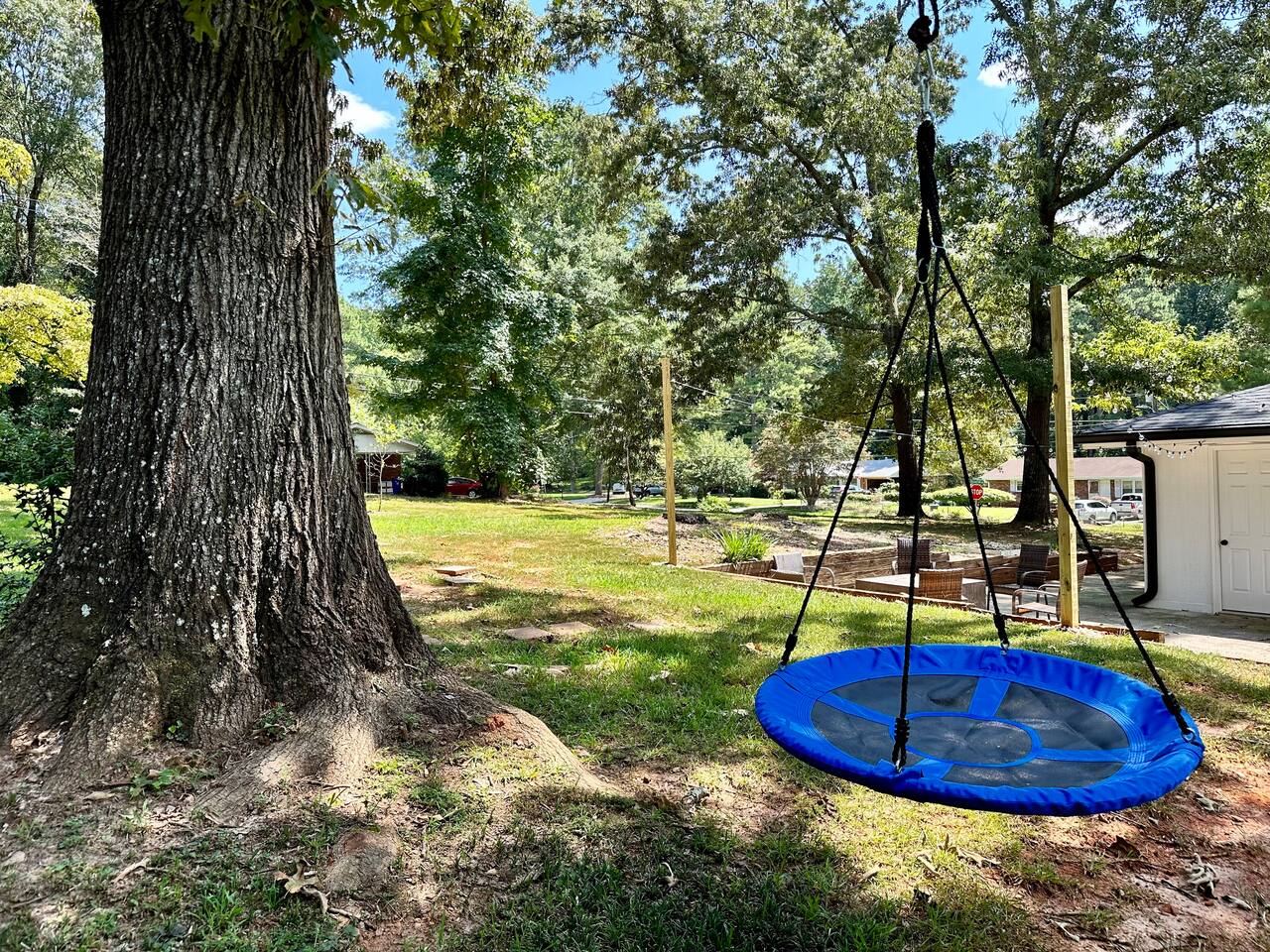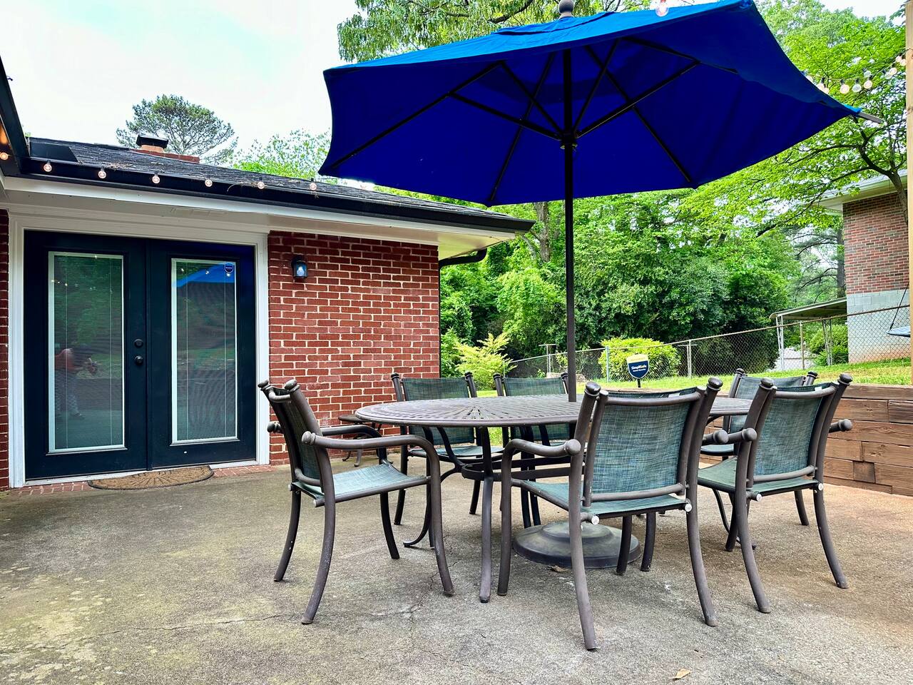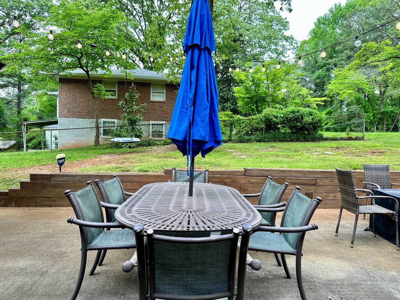 **HIGHLIGHTS** CONVENIENT LOCATION - 6 mins → downtown Stone Mountain, with locally owned shops, restaurants, breweries, book stores, coffee shops, & more - 8 mins → Stone Mountain Park - 25 mins → downtown Atlanta - 30 mins → ATL International Airport - Located in a quiet, residential neighborhood WELCOMING ENTRY - Lighted front porch entry - Detailed, step by step check-in directions - Smart lock access for ease of access - Alarm system available for additional security - Carport parking, plus additional driveway space available - Guidebook with local recommendations provided RELAXING BEDROOMS/BATHROOMS (no stairs required) - Primary bedroom suite: king bed, 40” smart tv, seating area, attached full bathroom with walk-in shower - Primary bathroom ensuite: walk-in shower - Bedroom 2: queen bed, 40” smart tv, hanging egg chair - Bedroom 3: (2) twin beds, 40” smart tv, side chair - Bathroom 2: tub/shower combo, full-sized laundry 2 ENTERTAINING LIVING ROOMS - Living room 1: hypoallergenic, leather-like sofa and 2 chairs, 58” smart tv - Living room 2: hypoallergenic, leather-like sofa, 55” smart tv, office desk with chair, French doors onto back patio STOCKED KITCHEN/DINING - Cooking and dining essentials, including children’s dinnerware - Major appliances plus: microwave, K-cup Keurig coffee maker, & drip coffee maker - Access to carport - Dining table with seating for 4 SOAK IN THE OUTDOORS - Outdoor dining table with seating for 6 - Umbrella for shade - Sprawling backyard - Hanging tree swing - Gas fire pit with seating for 4 - Bistro set for 2 under covered patio - Italian string lights for ambiance BRING THE FAMILY - Single story home, no steps required - High chair - Pack and play travel crib - Kid-friendly dinnerware - Large corner-lot yard - Tree swing - Walk-in shower in master bathroom - Bathtub in Bathroom 2 - 2 Living rooms - TVs in all bedrooms and both living rooms - Office desk with ergonomic chair - Full sized laundry - Quiet, suburban street IDEAL FOR TRAVELING PROFESSIONALS - Dedicated office desk and ergonomic chair (in a room with a door, Living Room 2) - Iron & ironing board - Highspeed WiFi ADDED FOR COMFORT - Extra linens and pillows - Smart home features: smart locks, alarm system, electronics, and high-speed WiFi - Carport parking - Kid-friendly amenities - Mobility-conscious design - Pet-friendly amenities - A Meta-CapitalLLC listing: Superhosts, so you can be confident in a pleasant experience